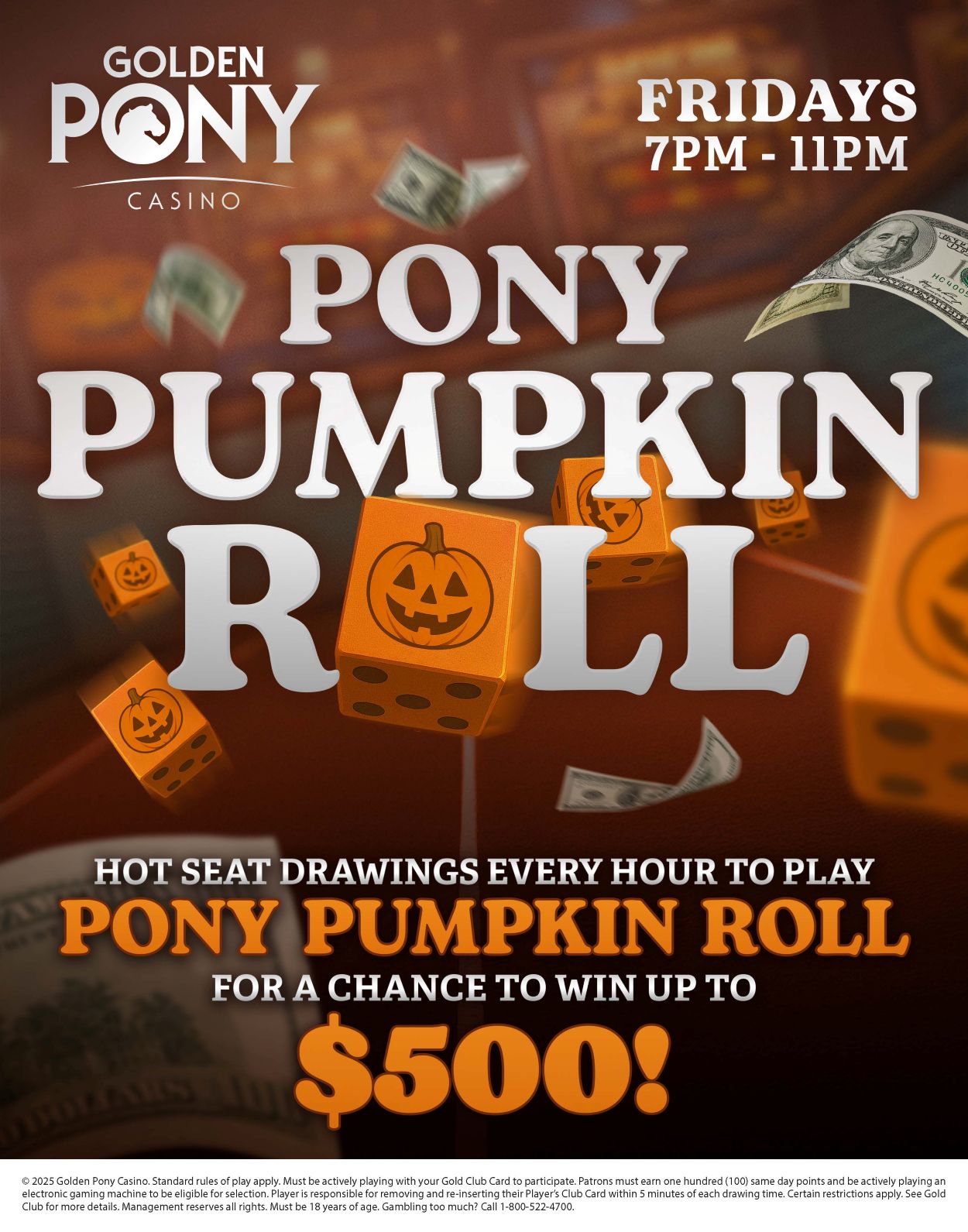 Hot Seat Drawings every hour to play Pony Pumpkin Roll for a chance to win up to $500!